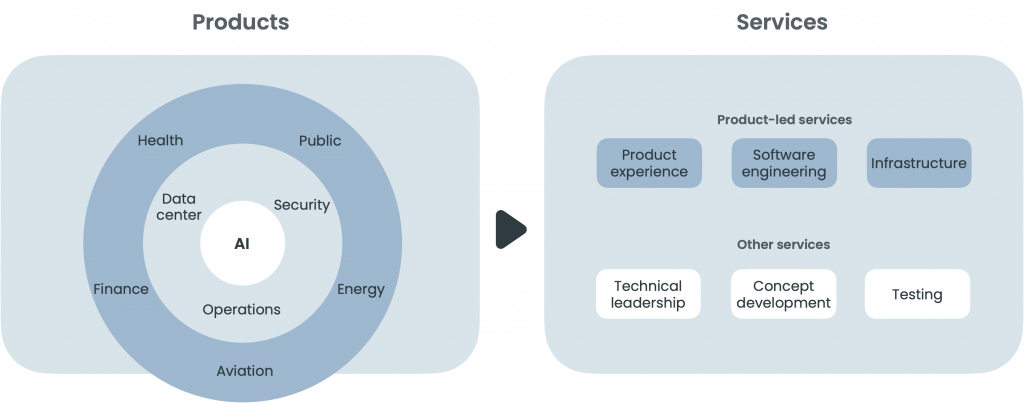 Trifork’s go-to-market model is focused on productizing solutions with our service offering attached to the product engagements. Our core product areas are in health, financial services, energy, aviation, and public sector. These products are based on state-of-the-art AI functionality supported by hosting, security, and cloud operations.
